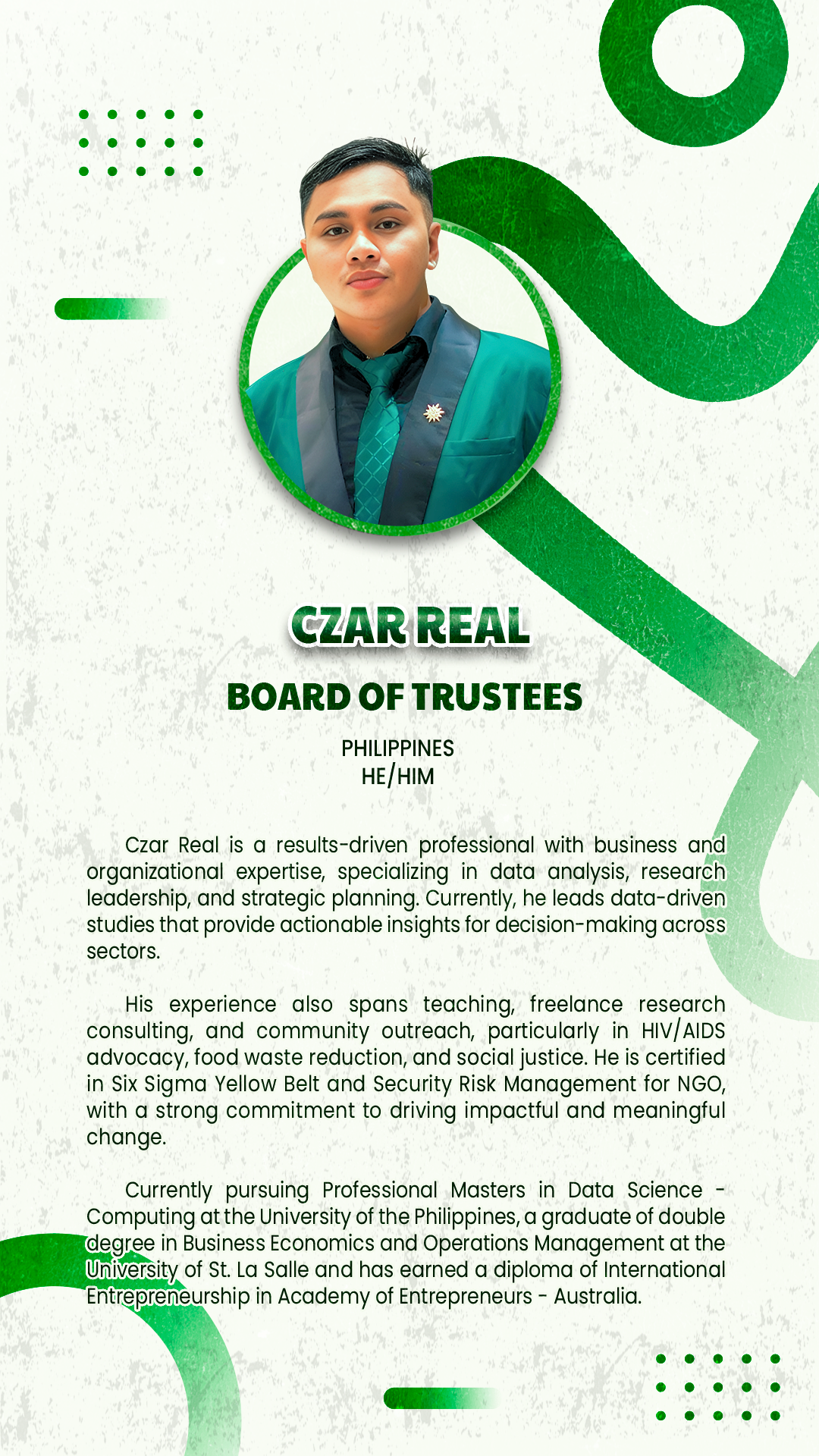 Mx. Toni graduated with a bachelor’s degree of secondary education majoring in English at the Capiz State University back in 2021. Aside from this, they sought out other educational opportunities such as Advocacy and Project Management at the Women Deliver Digital University (2015), International Women’s Health and Human Rights at Stanford University (2014), and Global Health and Humanitarianism at the University of Manchester (2013).